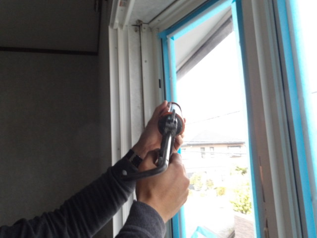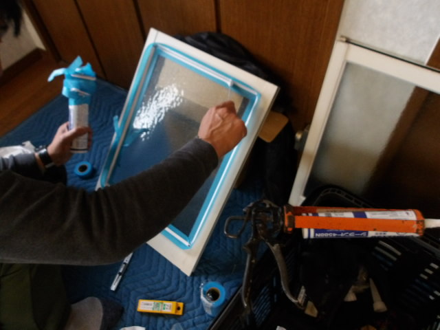 キッチンの窓を取り外し、両面のシーリング打ち込み・押さえ。