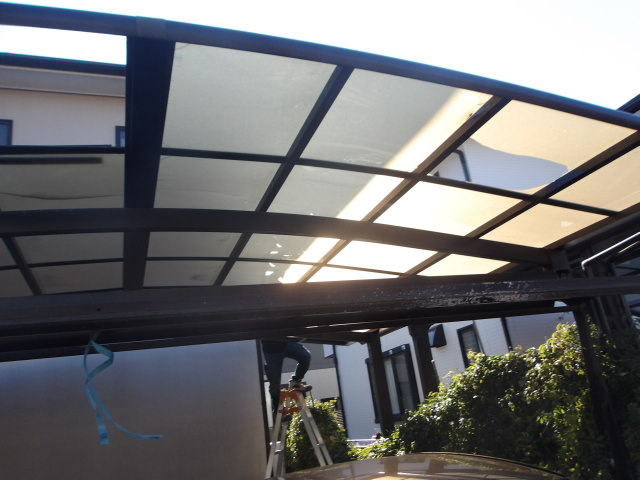 この度は、割れたカーポートのパネル取り替え依頼で、パネルをはずして採寸。