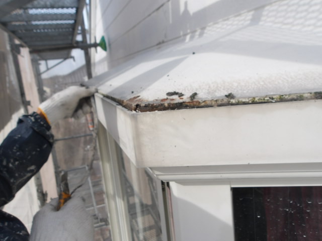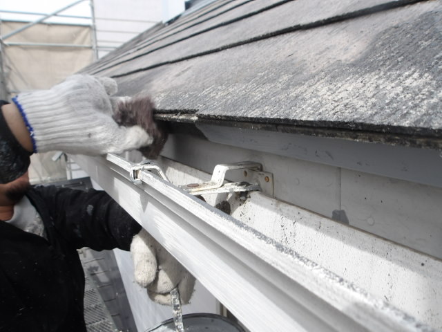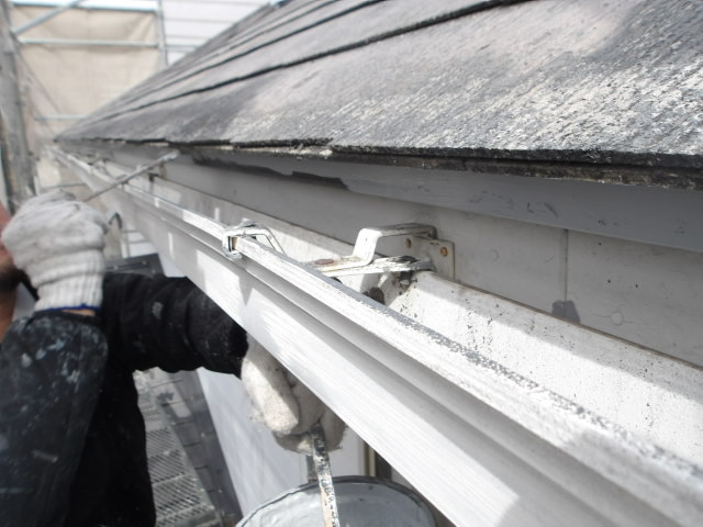 鉄部ケレン、錆止め塗装、外壁他補修、破風板・竪雨樋 溶剤シリコン下塗り、屋根 パワーシーラー下塗り。