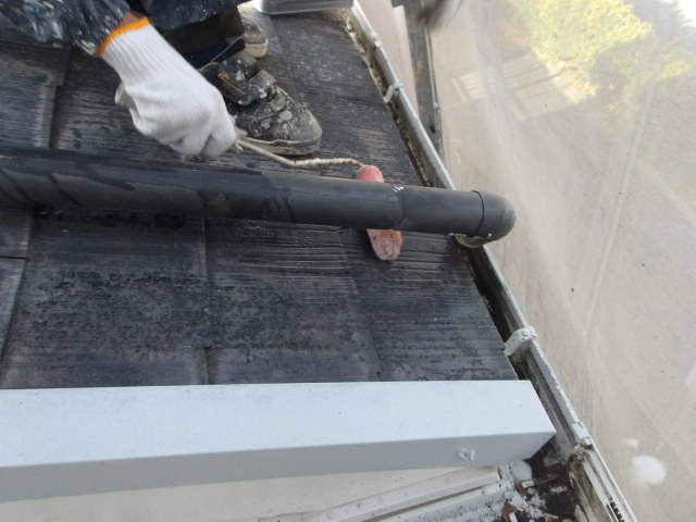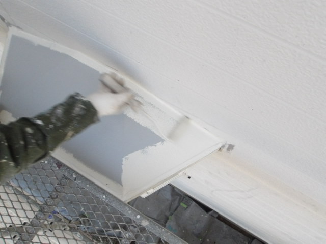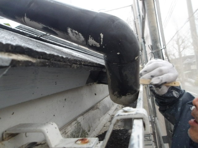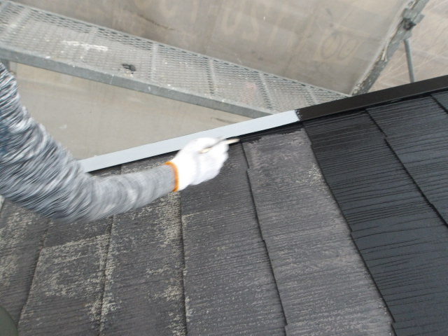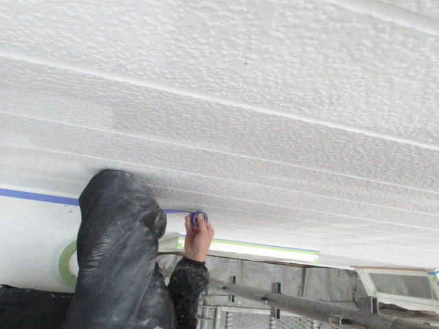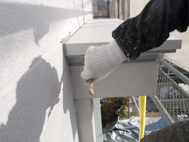 シャッターBOX等鉄部 ケレン・錆止め塗装続き、鉄部・出窓天場等 溶剤シリコン中塗り続き、下屋根 パワーシーラー下塗り、大屋根 水系カスタムシリコン中塗り、大・下屋根鼻先ブリキ中塗り・上塗り、各部養生。