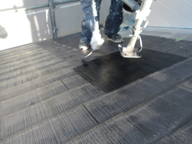 軒天井 湿気透過型塗料下塗り・上塗り、外壁 シーラー下塗り セラミシリコン中塗り・上塗り、大屋根一部 水系カスタムシリコン上塗り、下屋根 足場支柱下の中塗り・上塗り、下屋根ブリキ及び周辺と鼻先の中塗り。