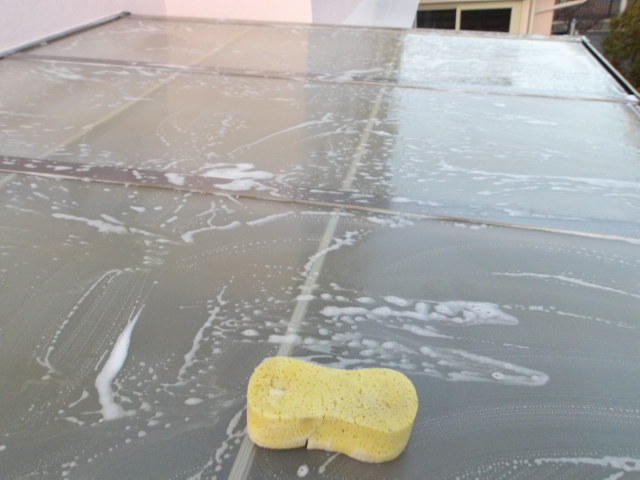 サンルームパネル手洗い。