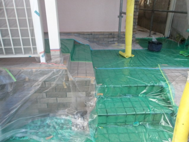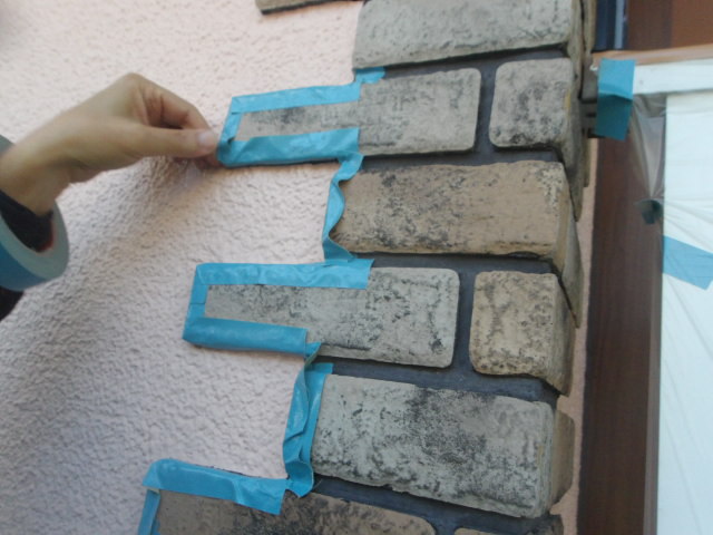 初回の塗装工事の際正面各コーナーに貼ったレンガタイルを一枚ずつ養生。