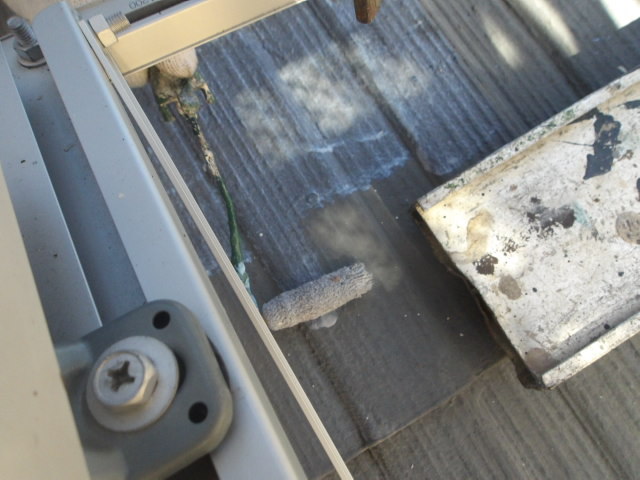 下屋根のエアコン室外機の架台の下や足場の柱の足元を浮かせてのシーラー塗装。