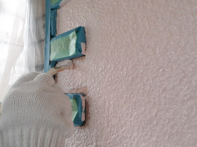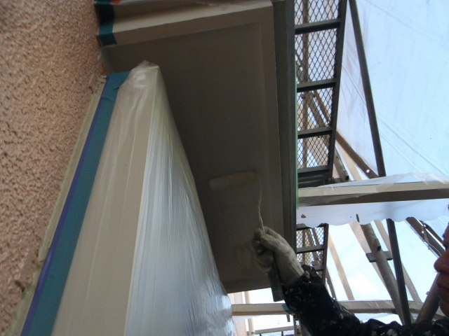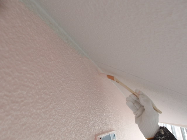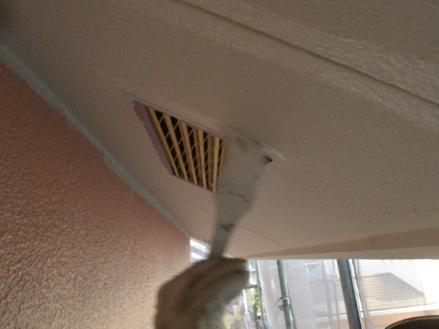 西・南面軒天井と外壁の取り合い、刷毛中塗り。