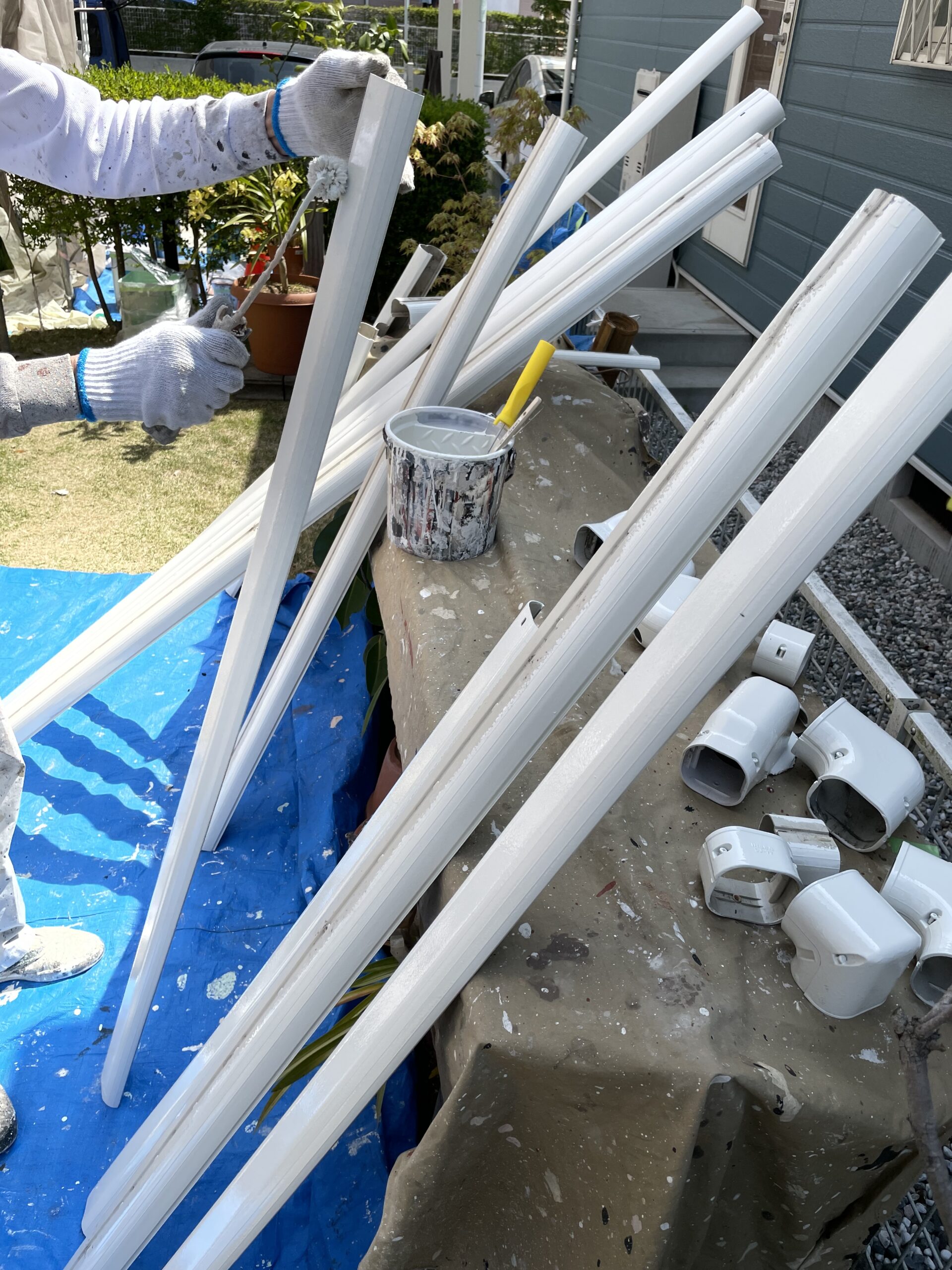 本日の工程。外壁・屋根・その他部位の塗装。2階野地板・破風板・横樋溶剤シリコン上塗り。1階野地板・破風板・横樋、下塗り、上塗り。竪樋上塗り。雨戸・水切りブリキ中塗り、上塗り。シャッターBOXケレン、錆止め、中塗り、上塗り。エアコンスリムダクト下塗り、上塗り。下屋根(1階屋根)遮熱型溶剤シリコン上塗り。