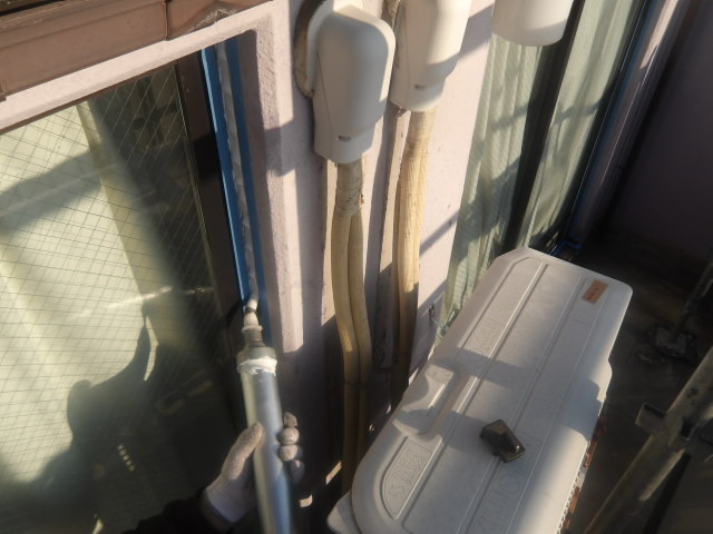 本日の工程、外壁補修・シーリング工事4日目。シーリング切り取り箇所の養生・プライマー塗布、5階バルコニー内・4階・3階西面サッシ周りシール打ち込み・押さえ、5階エアコン配管カバー(スリムダクト)撤去、雨樋内のゴミ・苔の除去。