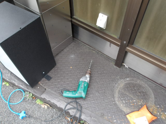 マンション前の鉄板にドリルで穴お開け、宅配BOXを固定。
