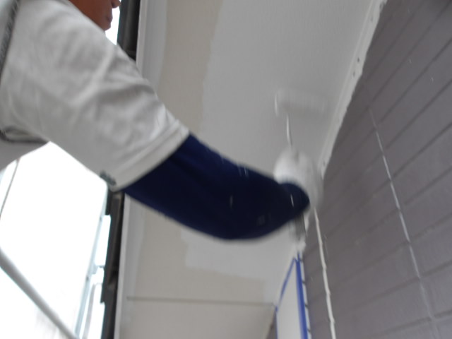 本日の工程、大屋根マイルドフッ素遮熱南面下塗り、竪雨樋溶剤シリコン下塗り続き、軒天井東・南面の各一部湿気透過型塗料下塗り・上塗り、各部養生続き。午後からは降雨で作業中止。