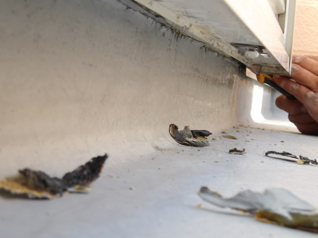 サッシ下し施地シール切り取り後、エアコン室外機移設・養生