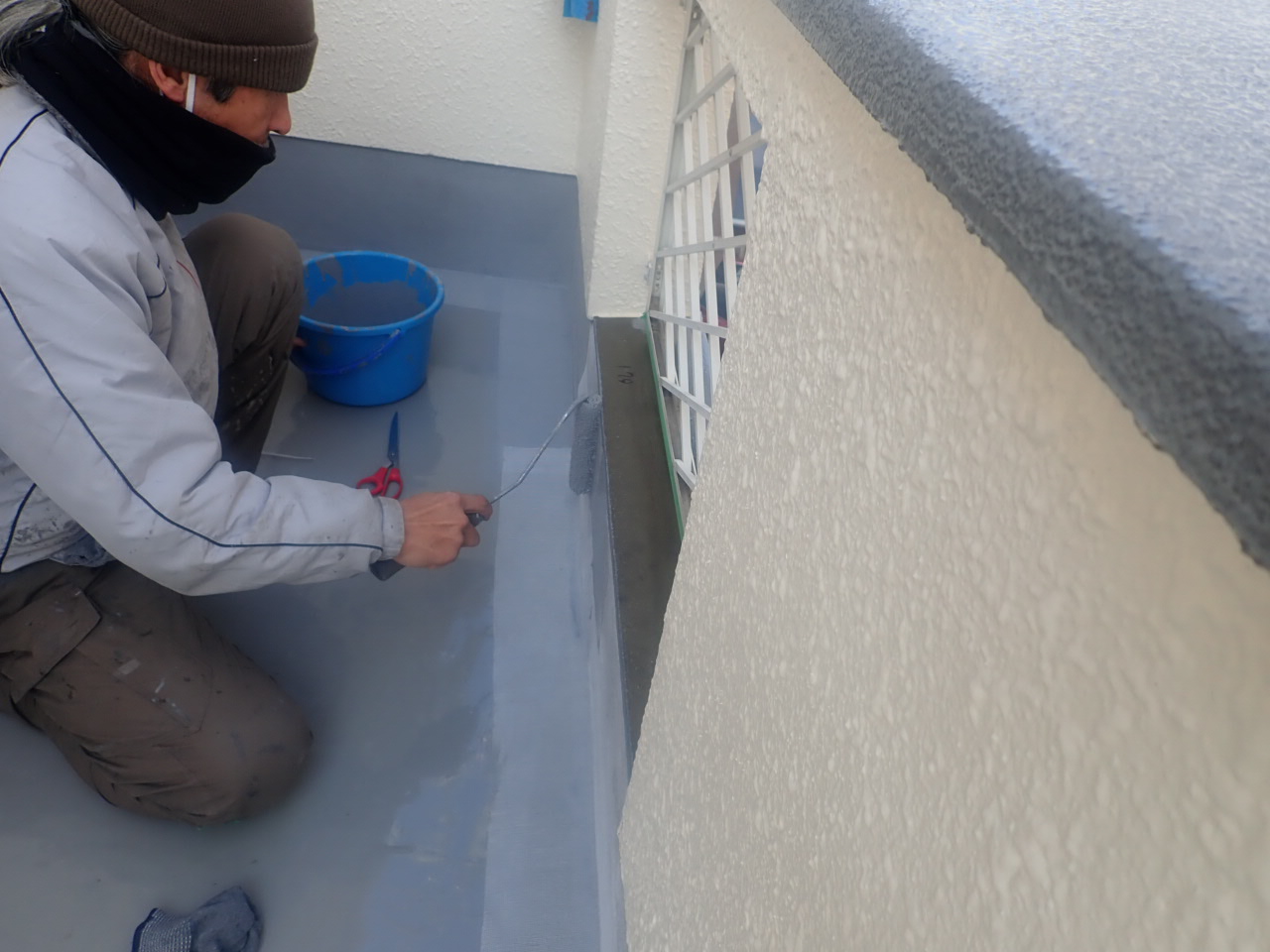 本日の工程、ウレタン防水2日目。立ち上がり・テラスなどの柱根本部、クロス挿入工法ウレタン防水2回塗り。