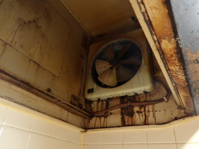 設備工事。レンジフード・ガスコンロ・浴室物干し取り替え。レンジフード施工前。