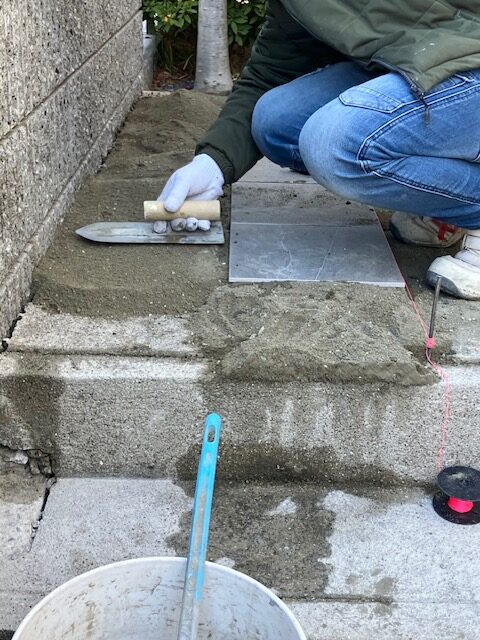 13日に2度目のシーリング・各塗装工事完了し足場解体に引き続き、玄関アプローチ・階段タイル貼り、階段手摺り新設工事。