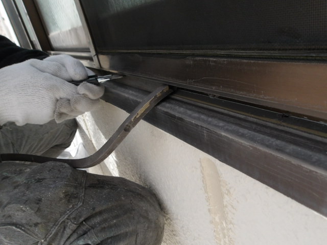 サッシ面台の既設シール切り取り。