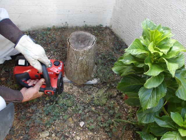 前回枯れた紅葉を伐採した後の切り株を、根元から再度伐採。
