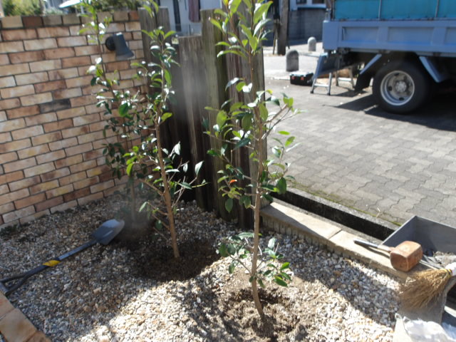 垣根にもよく使われるレッドロビン。今回は垣根ではなく樹木としての植樹なので、育ちよくするために間隔をあけて植樹。