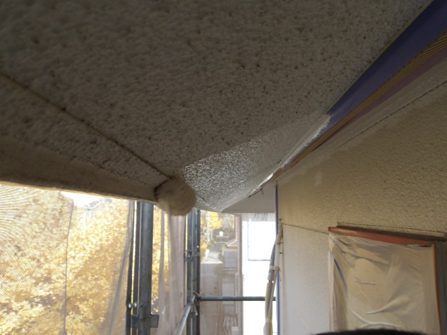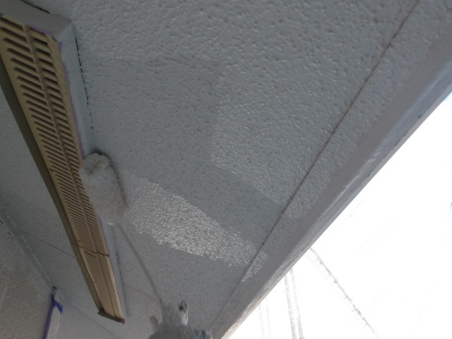 養生済み面の西・南・北面軒天井・小庇天井・玄関ポーチなど湿気透過型塗料上塗り。