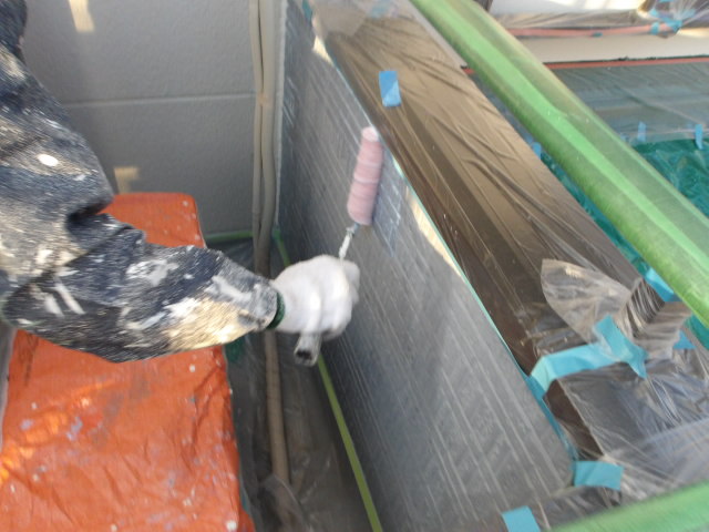 各部養生続き、大屋根残り1面クールタイトフッ素上塗り、養生済み面の西・南・北面軒天井・小庇天井・玄関ポーチなど湿気透過型塗料下塗り・上塗り、東面2階下塗り、2階外壁シーラー下塗り。