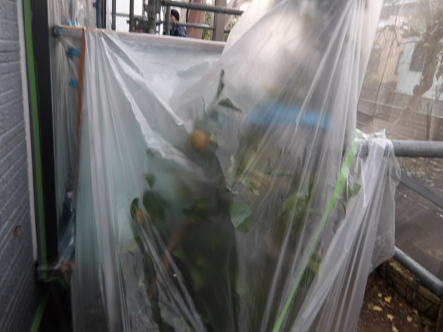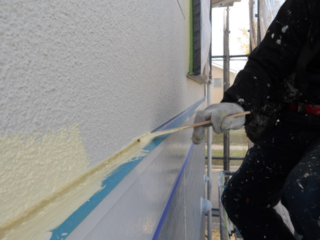 養生残り、東面1階軒天井 湿気透過型塗料下塗り、同2階・1階上塗り、東・北1階外壁シーラー下塗り、2階全面 プレミアム無機中塗り・上塗り、東・北面1階サイディング面中塗り。