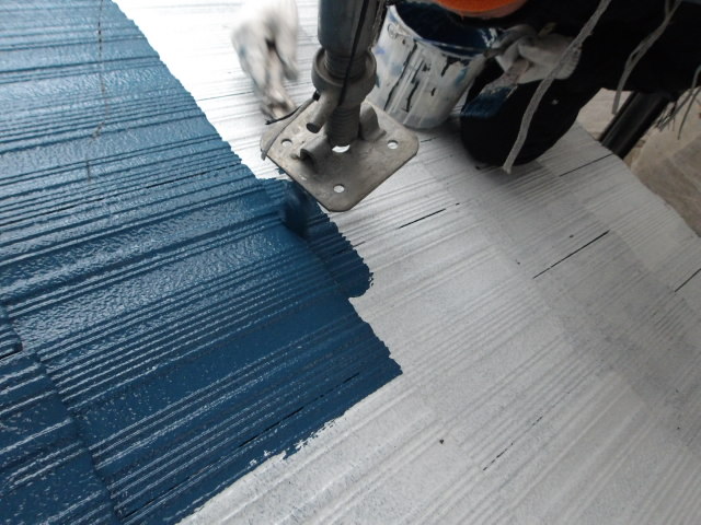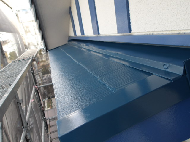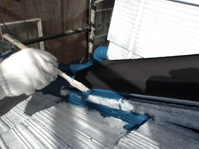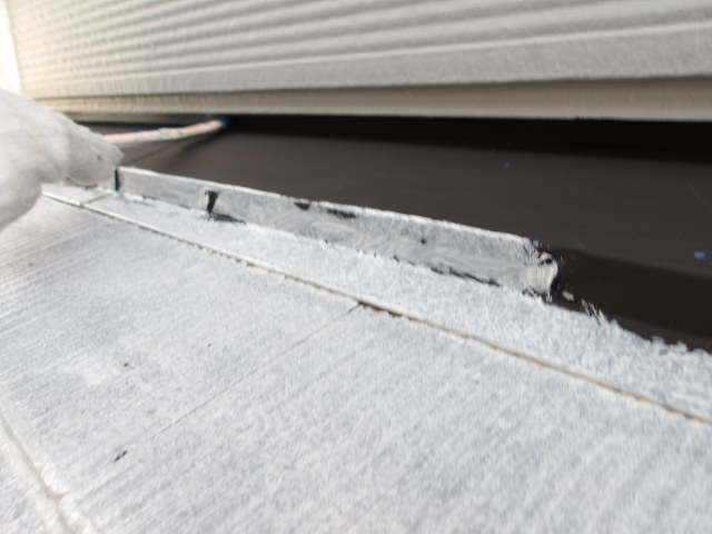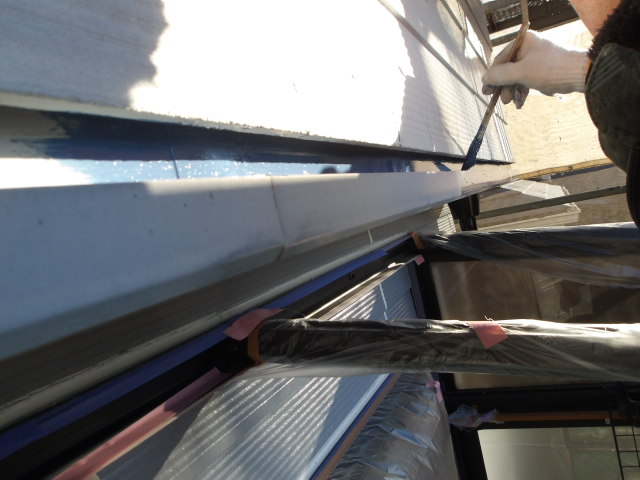 下屋根・玄関ポーチ屋根の壁際の中塗り。