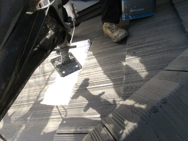 下屋根・玄関ポーチ屋根の足場支柱の足元 クールタイトシリコン中塗り。