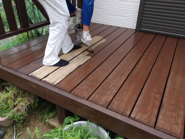 一昨日足場解体後のウッドデッキ床部仕上げ。、昨日が雨で本日施工、全工程完了。