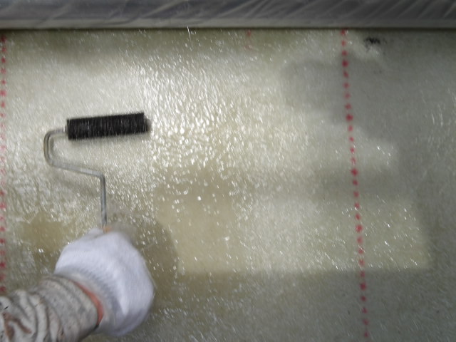 ポリエステル樹脂塗布後、硬質ローラーで押さえ。