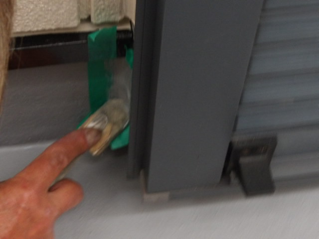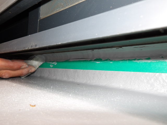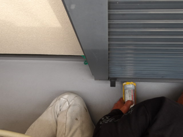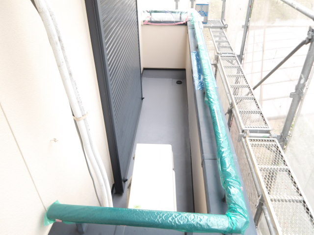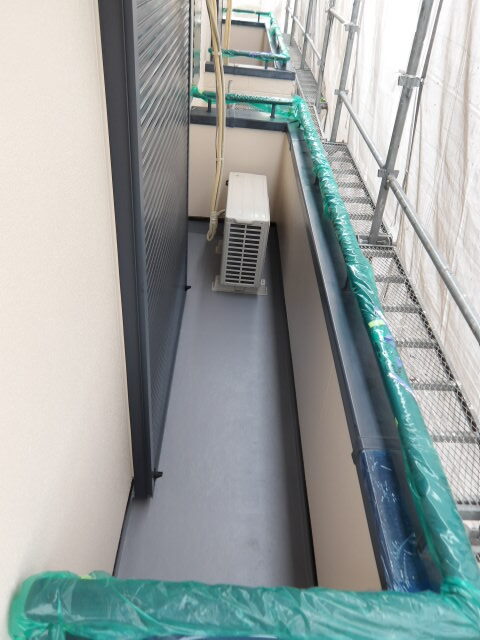 3箇所のバルコニーFRP防水改修工事のサッシ下シーリング、エアコン室外機復旧。午前中で完了。