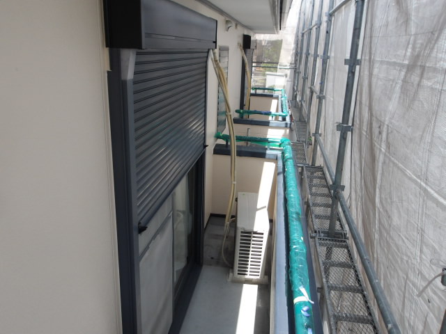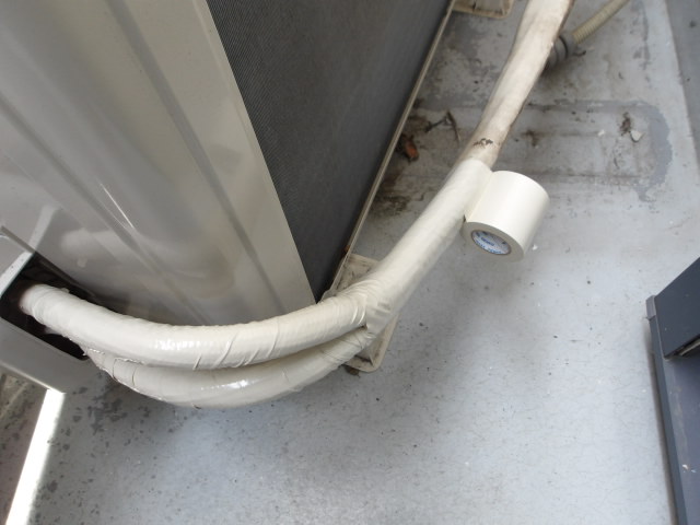 3カ所のバルコニー内の各エアコン室外機配管テープ巻き。