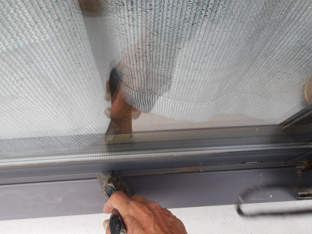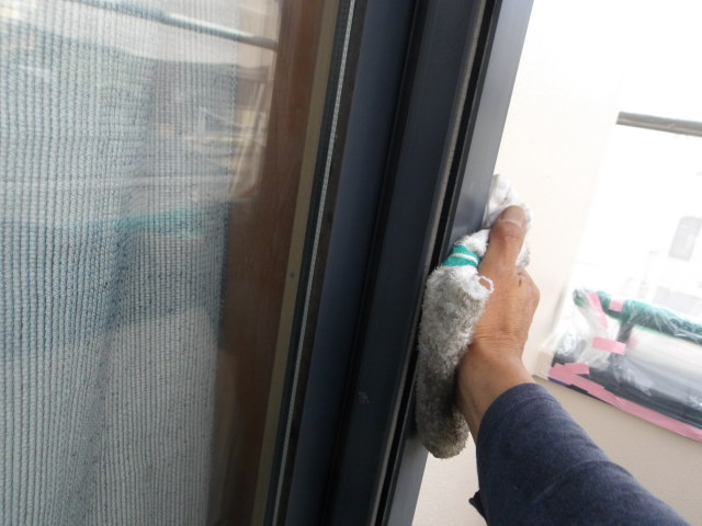各部養生。面格子の窓の養生は大変です。先ずはマスキングテープではみ出しを防ぎラインがしっかり出る様にしてから窓全体を養生。