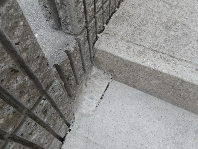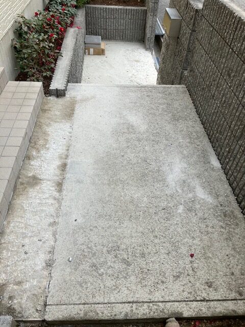 タイルを貼ることにより門前の段差が高くなるので、タイル貼りしろ分を斫り既設の階段や門前の段差とタイル施工後の段差に違和感が無い様に。