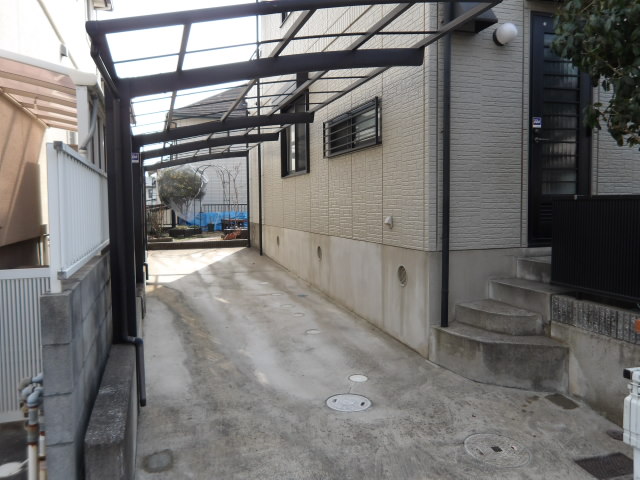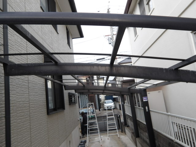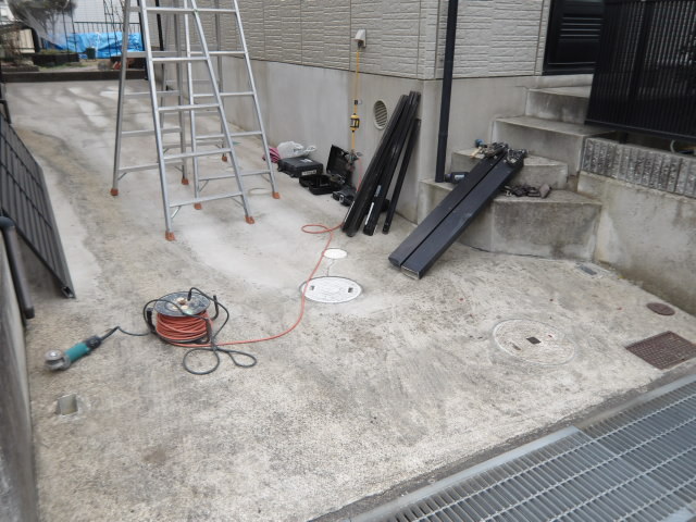 足場架設前につきカーポートの一旦撤去、既設オーバーゲートと門扉を撤去処分。