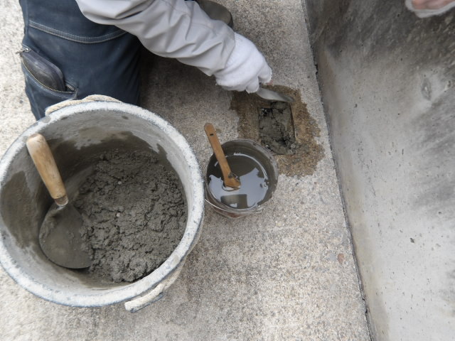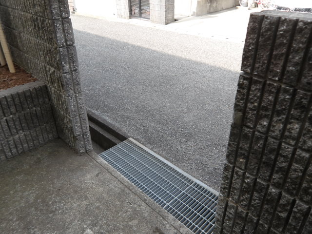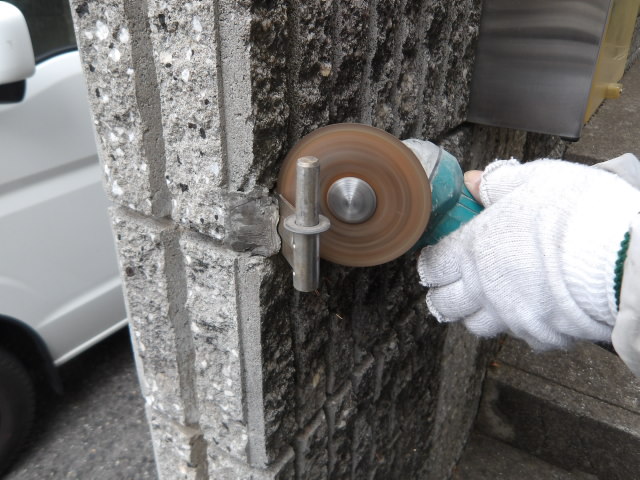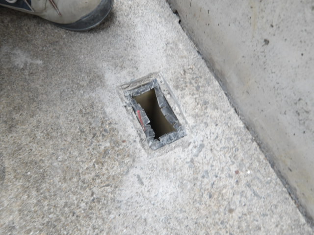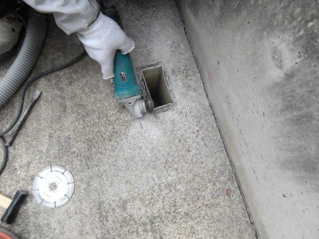 支柱の金属跡見えない様にと駐車場土間の土間の高さに合わせるため、切断した支柱の周りのコンクリートを除去。