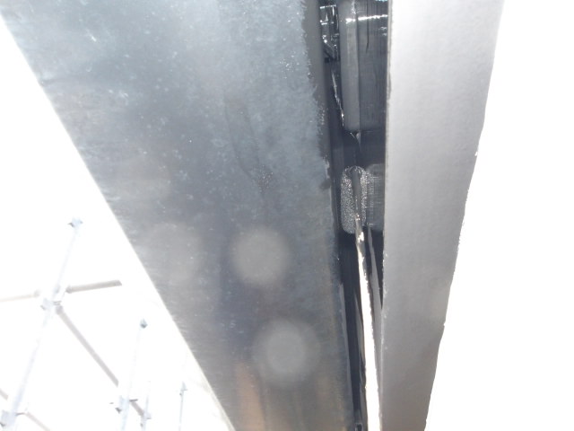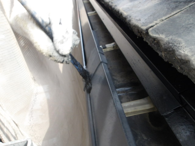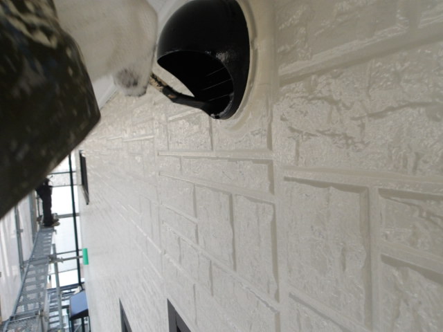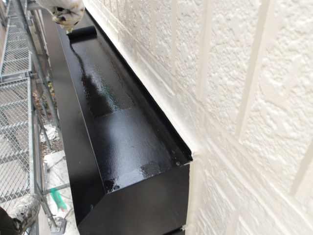 点検続きでタッチアップ・ライン出し・はみだしの拭き取り、溶剤シリコン 野地板・破風板・軒雨樋・屋根上換気口の鳩小屋等上塗り下塗り・上塗り、エアコンスリムダクト・シャッターBOX・竪雨樋・帯(幕板)・パラペット・ガラリ・レンジフードカバー・小庇ブリキ・、屋根 シーラー下塗り残り、鼻先瓦 ガイナ中塗り・上塗り、エアコンテープ・スリムダクト・勝手口灯復旧。