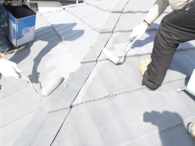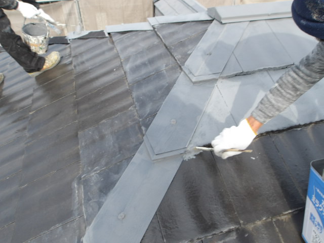 補修後の棟周辺の瓦シーラー下塗り。奥に見える鼻先瓦は、外断熱塗料ガイナ 先般仕上がり済み。