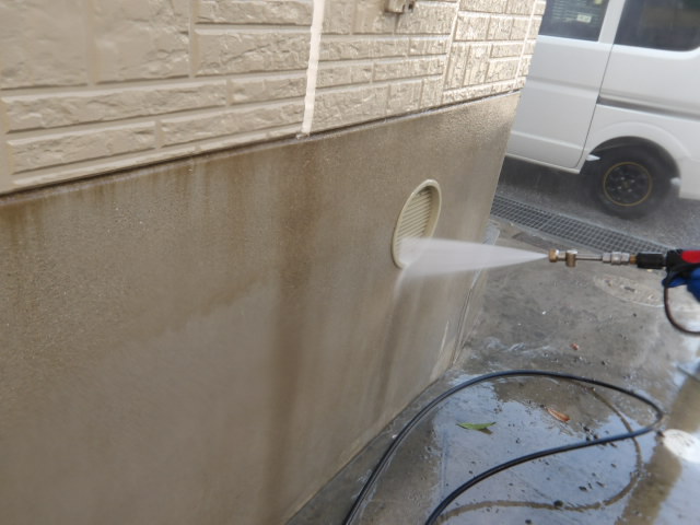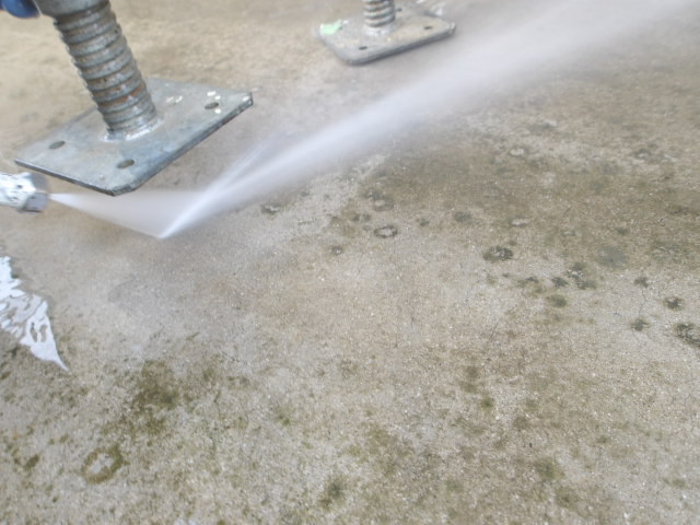 足場の柱の足元も一旦上げてコンクリート土間を洗浄。