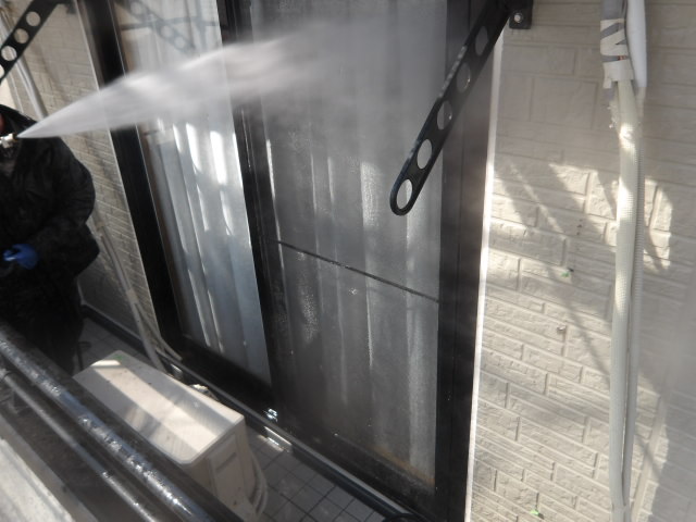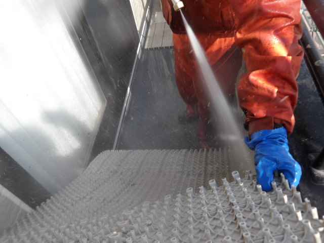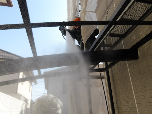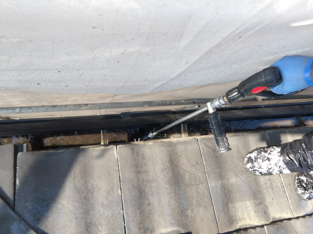 屋根洗浄。雨樋の中、特に竪樋の落とし口はゴミ爪理が無い様に念入りに洗浄。