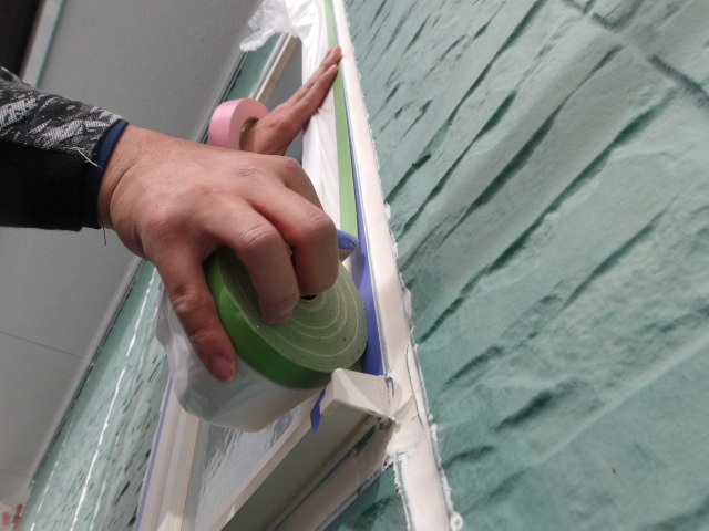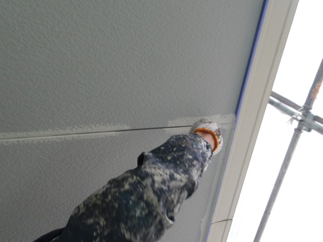 各部養生続き、2階東・北面軒天・1階玄関ポーチ・バルコニー天井部 湿気透過型塗料下塗り・上塗り、外壁 シーラー下塗り、プレミアムシリコン中塗り、南面・2階バルコニー内上塗り。