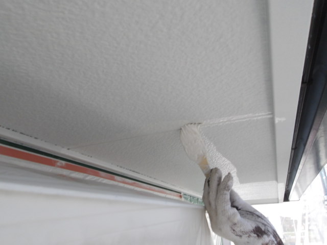 2階東・北面軒天・1階玄関ポーチ・バルコニー天井部 湿気透過型塗料下塗り。