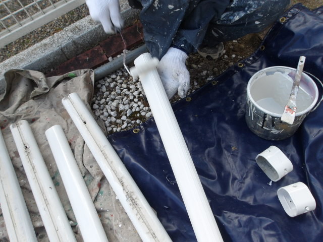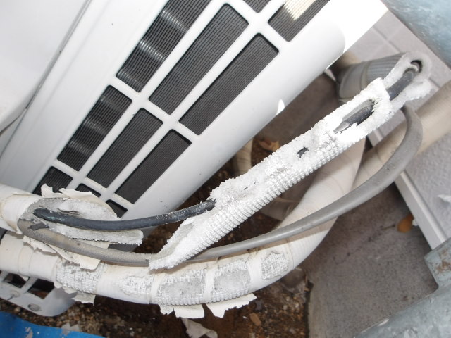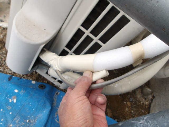 エアコン配管保護剤破損部取り替え、テープ巻き直し。