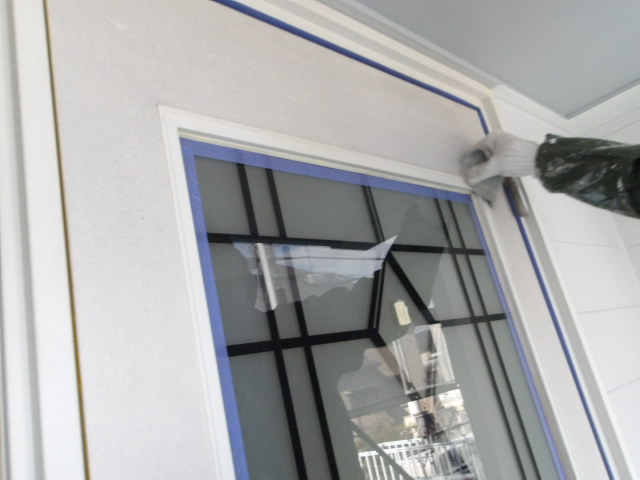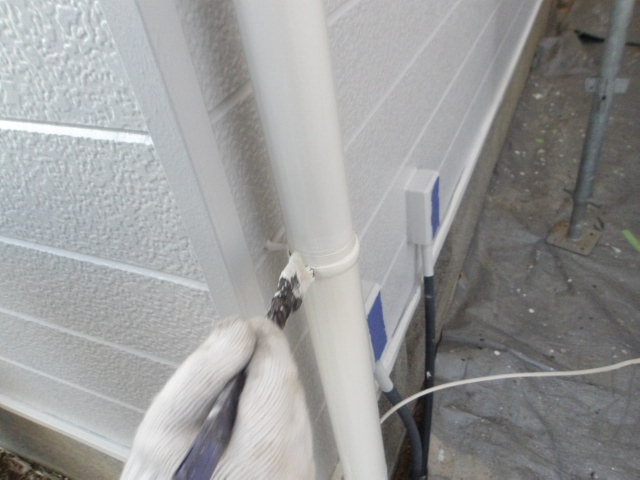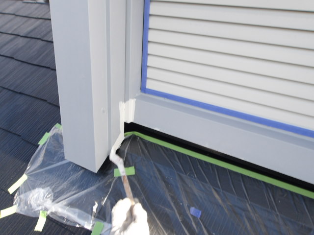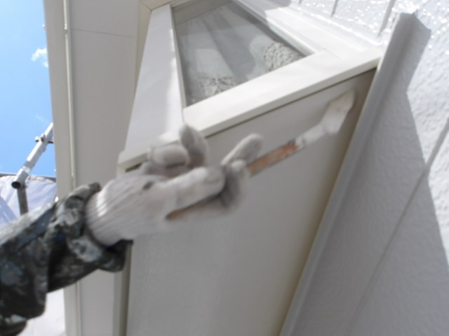 外壁と軒天井取り合い セラミシリコン上塗り、養生ばらし、溶剤シリコン 破風板・軒雨樋下塗り、2階破風板・軒雨樋上塗り、シャッターBOX中塗り・上塗り、大屋根鳩小屋ブリキ中塗り・上塗り、出窓天場・下場・換気カバー・小庇ブリキ上塗り、エアコンスリムダクト下塗り・上塗り、水切りブリキ上塗り、玄関枠下塗り、下屋根壁際ブリキ 水系カスタムシリコン中塗り、大屋根上塗り、エアコンテープ巻き、2階サッシ清掃・窓ガラス拭き。