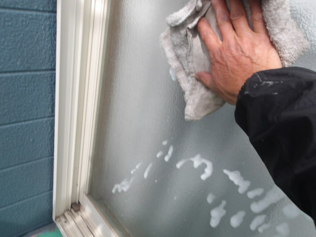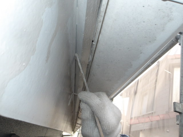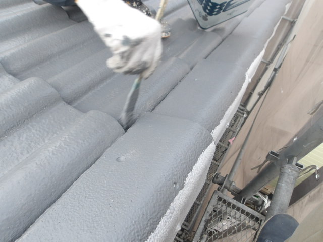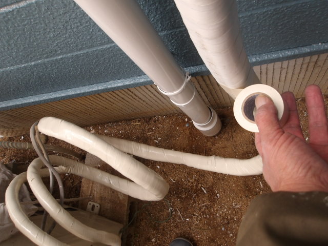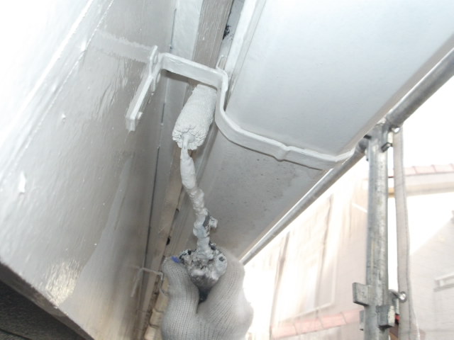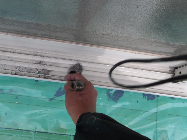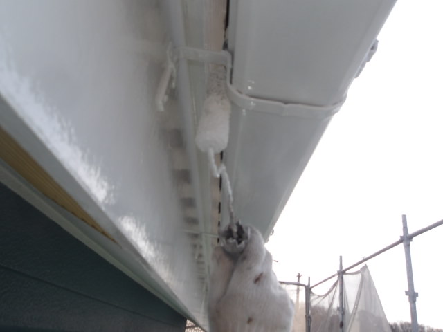 溶剤シリコン 野地板残り上塗り、破風板・軒雨樋残り下塗り・上塗り、大屋根 クールタイトフッ素中塗り・上塗り、外構部 湿気透過型塗料下塗り、エアコンテープ巻き残り1台、2Fサッシ清掃・窓ガラス拭き。