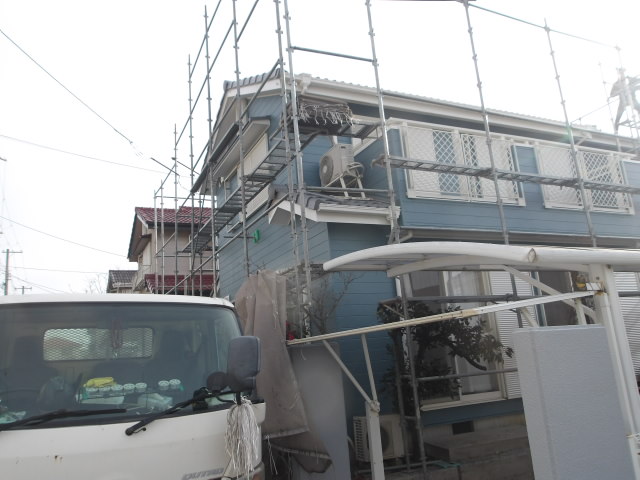 足場解体完了。明日から植栽伐採、ウッドデッキ・テラス・フェンス新設、玄関ドア取り替えカバー工法の各工事。