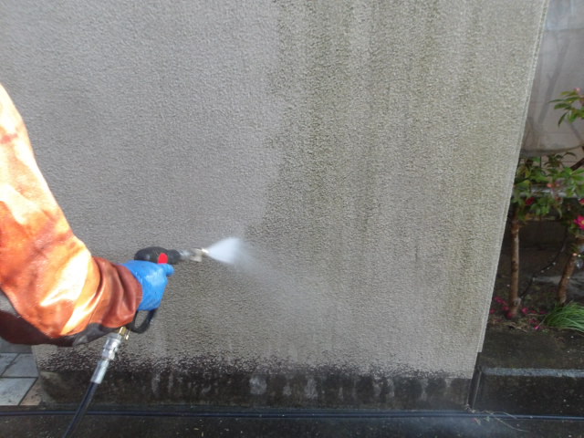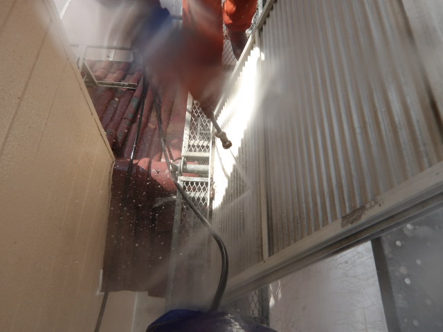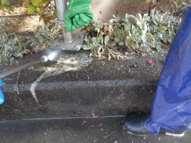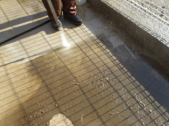足場の下のコンクリート土間も足場の跡形が付かない様に、足を上げて高圧洗浄。