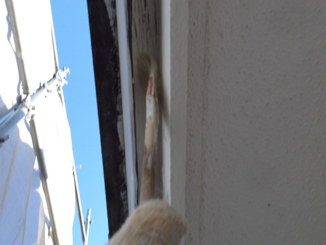 各部養生続き、溶剤シリコン 鉄部中塗り、野地板・破風板・竪雨樋他下塗り、クールタイトシーラー 下屋根続き・大屋根・小庇屋根下塗り。