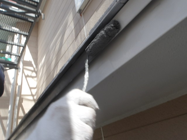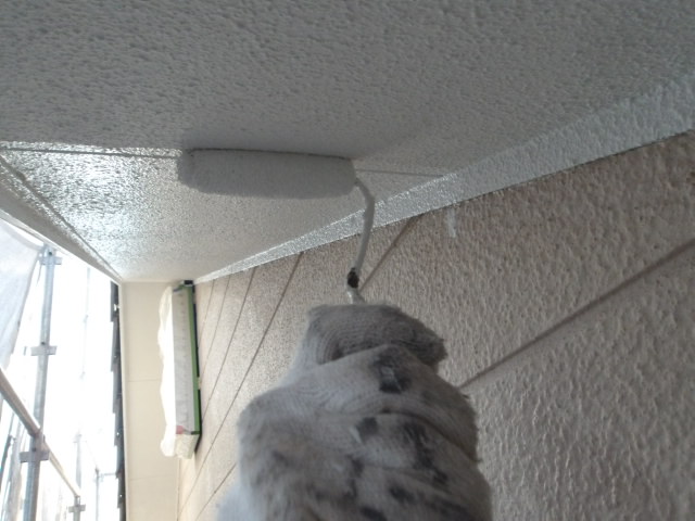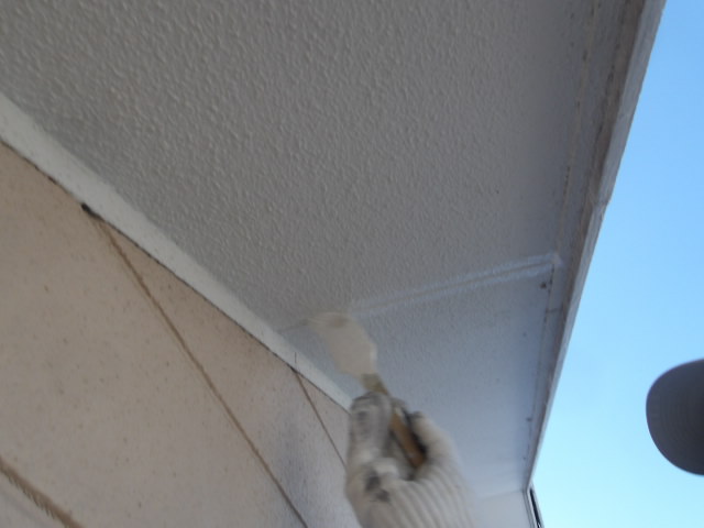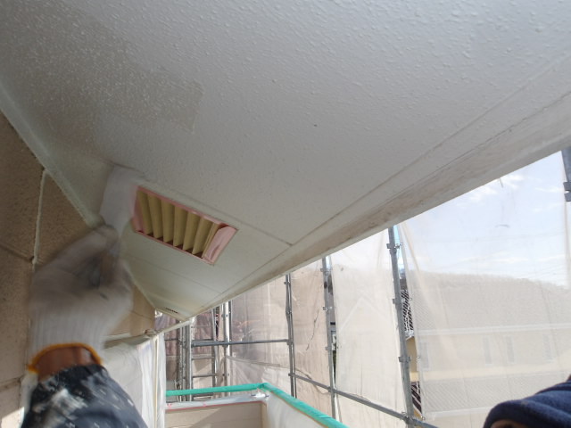 屋根上の外壁を先に仕上げるために、先ずは軒天井 湿気透過型塗料下塗り・中塗り。