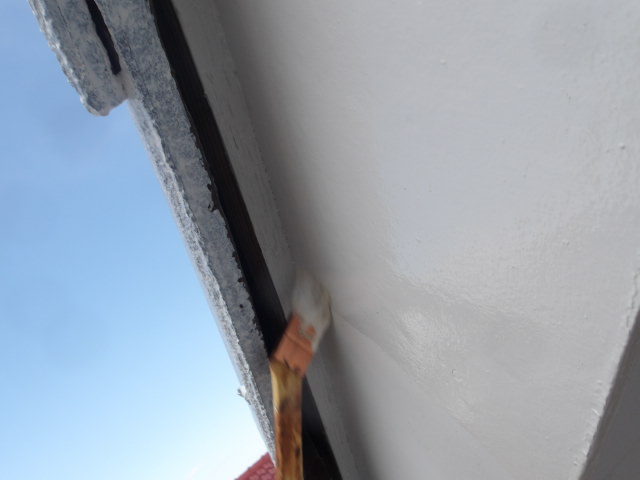 各部養生続き、バルコニー外壁の漏水による旧外壁塗膜欠損箇所パテ補修、屋根上の軒天井・破風板・外壁の仕上げ、小庇屋根・下屋根一部 クールタイトフッ素中塗り、軒天井・小庇天井・野地板 湿気透過型塗料下塗り、2階東面軒天井・小庇天井上塗り。