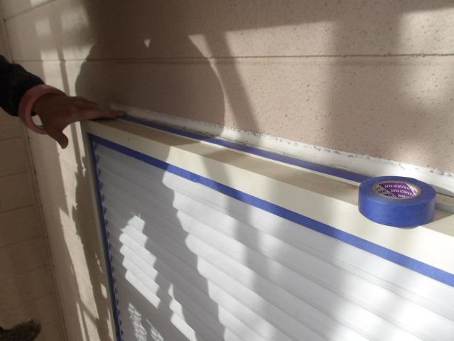 バルコニー外壁の漏水による旧外壁塗膜欠損箇所パテ補修。