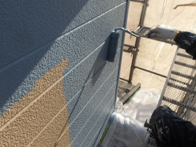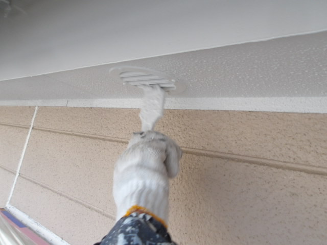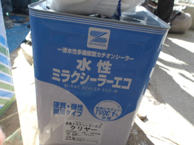 各部養生、軒天井・小庇天井残り 湿気透過型塗料上塗り、外壁 シーラー下塗り、2階北面・西面 プレミアムシリコン中塗り、大屋根残り クールタイトシーラー下塗り。