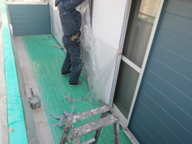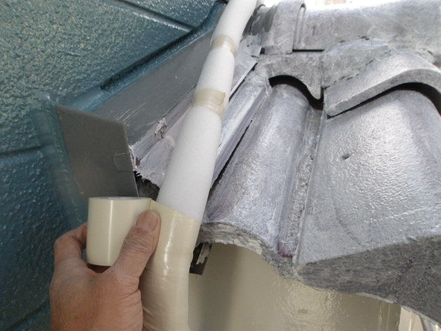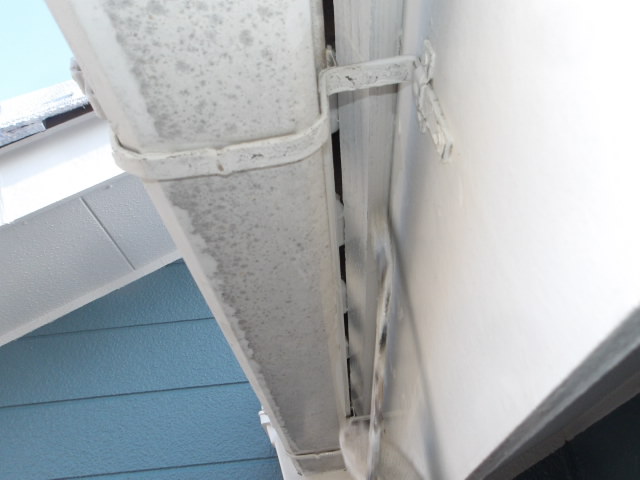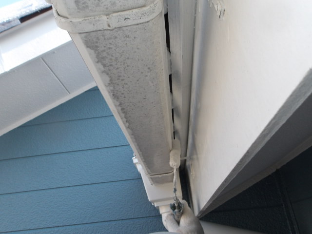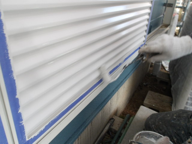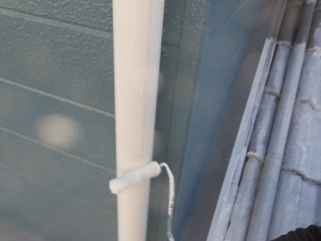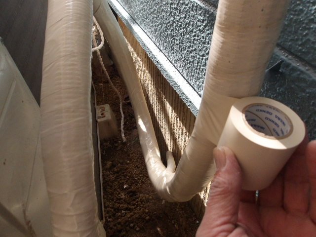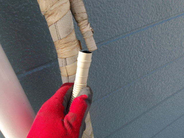 溶剤シリコン 雨戸中塗り・上塗り、エアコンスリムダクト下塗り・上塗り、北面野地板・竪雨樋上塗り、破風板・軒雨樋下塗り、エアコン配管・ドレンホース補修・テープ巻き。